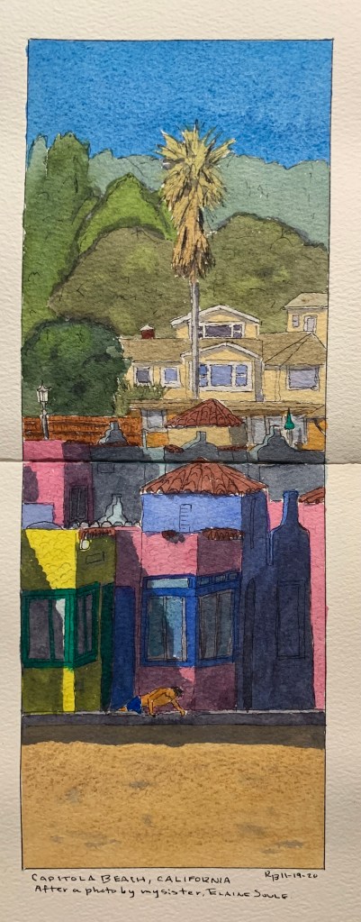 Capitol Beach, CA – After a photo by my sister, Elaine Soule – Two-page spread panorama in journal – ink sketch followed by shading using Jane’s gray followed by color washes (2020).