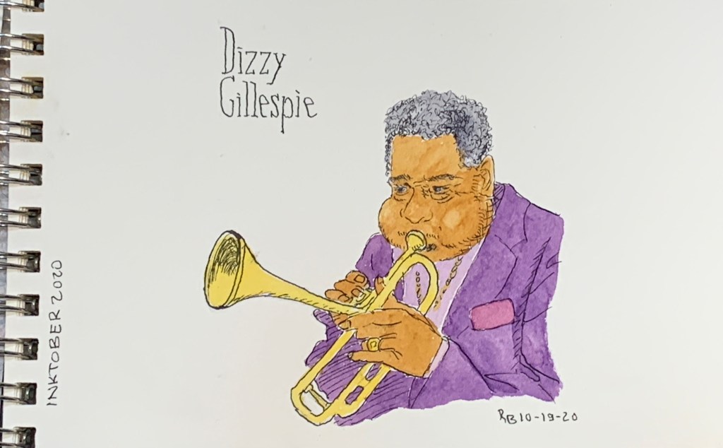 Dizzie Gillespie – Ink sketch and watercolor wash for Inktober, 2020.