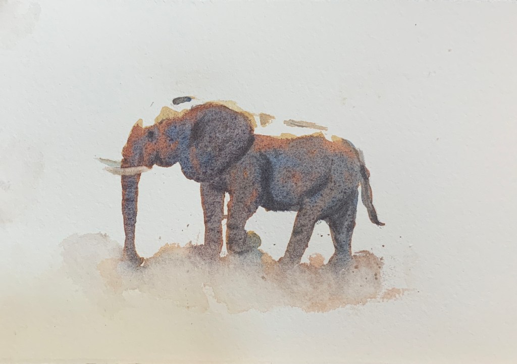 Elephant – 5 by 7 inches in watercolor sketchbook – after Hazel Soan – no preliminary drawing, brush only – goethite, then Indian red, then cerulean chromium wet on wet (2021).
