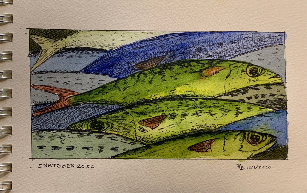 Fish Stall – ink sketch with watercolor wash – Inktober 2020.