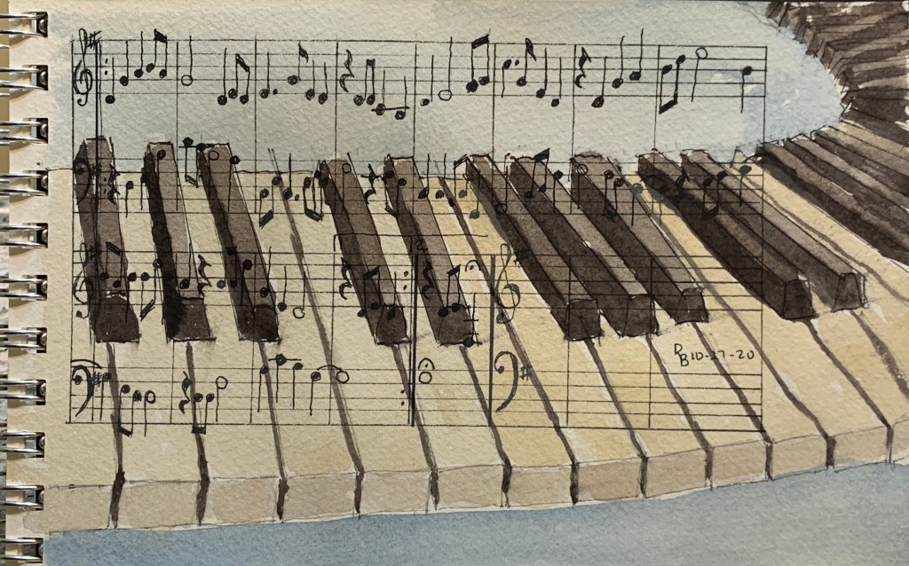 Music – Ink and watercolor in sketchbook (for Inktober, 2020).