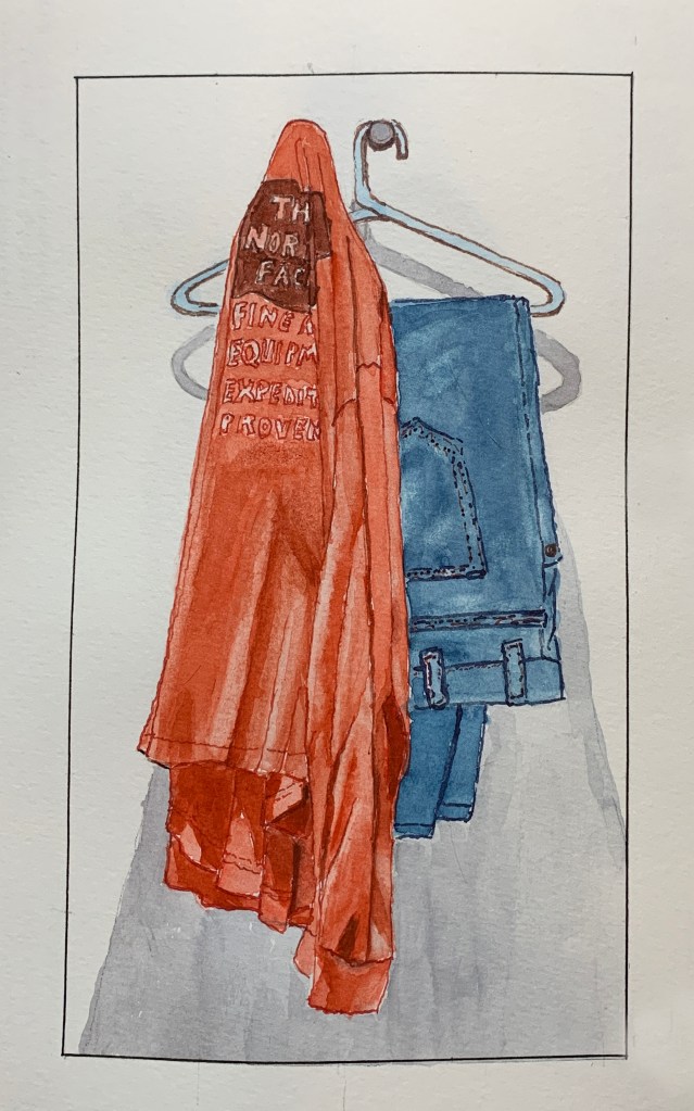 Jeans and old tee shirt – Ink and watercolor in sketchbook (2020).