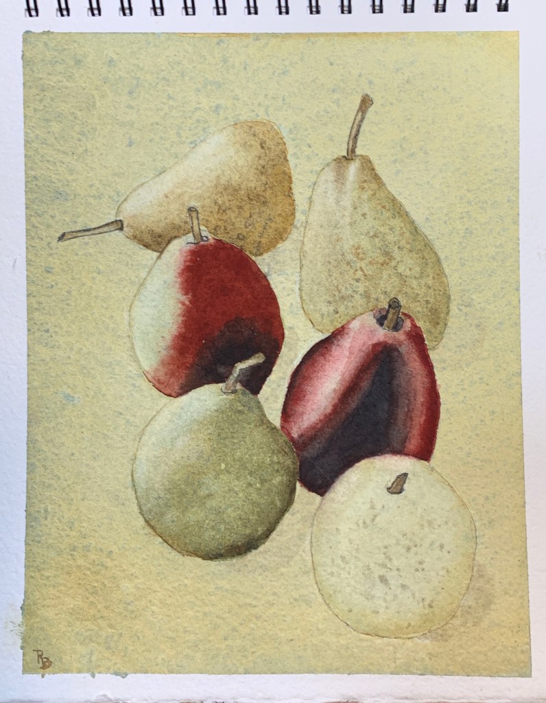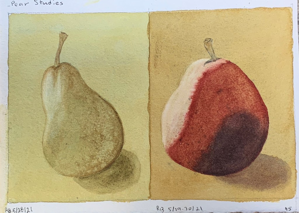 Pear Study – 5.5 by 8.5 inches – watercolor notebook, Arches 140 pound cold press watercolor paper – Jane Blundell Mastering Watercolors online class assignment (2021).
